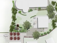 Mit dem Neubau eines weiteren Wohngebäudes auf dem vorhandenen Hanggrundstück wurde eine Neuordnung der bestehenden Freiflächen notwendig. Auf den ca. 1.200 m² großen Aussenanlagen entstand, neben dem ruhig und zurückhaltend gestalteten Garten- und Terrassenbereich mit zahlreichen Großgehölzen, eine baumüberstellte Piazza mit Zufahrt zur Garage und ein grooßzügiger Spielbereich.