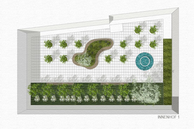 Gestaltung der Innenhöfe zwischen verschiedenen Versicherungsbebäuden durch intensive Dachbegrünung und Möblierung