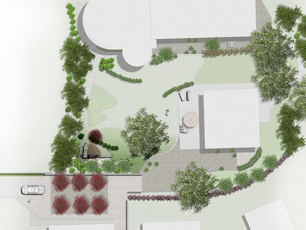 Umgestaltung einer Außenanlage als Übergang und Verbindung zwischen Generationen-Wohnhaus und Fabrikgebäude