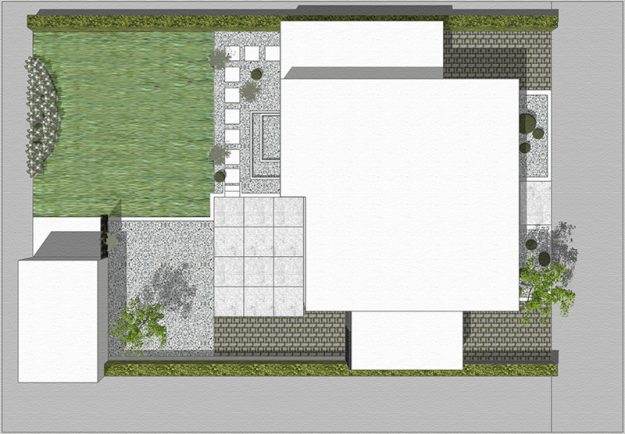 mit Räume bildenden Bereichen aus Großformat-Betonplatten, Kies-, Rasenfugenstein- und Rasenflächen
